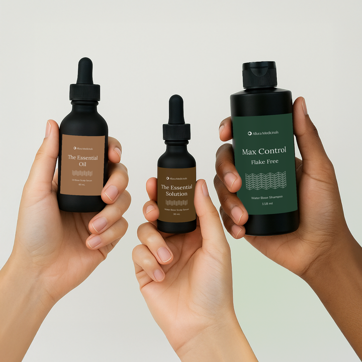 Allura medicinals uses a combination of anti-yeast and anti-inflammatory medications in our shampoo and scalp serums. As you can read about here, an itchy and flaky scalp is caused by overgrowth of yeast on the scalp followed by an inflammatory reaction to the yeast. We attack this from both angles at the same time, which is different from any commercially available prescription or over the counter medication.